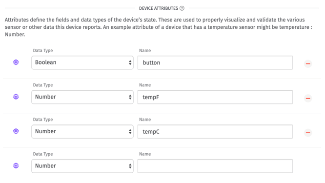 The device attributes specify what state information the device reports. The firmware that you’ll flash in the following sections will report whenever a button is pressed, the temperature in Celsius (tempC), and the temperature in Fahrenheit (tempF).