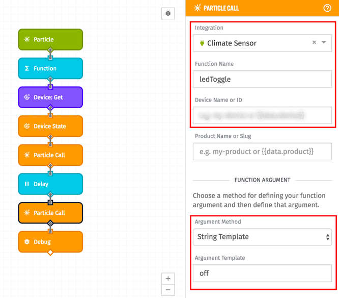 Let’s look at the code on your Particle device. If you look at line 9, you’ll notice Particle.function("ledToggle",ledToggle); That line of code registers a function on the Particle board that listens for the ledToggle command that can be called from Losant. To do this, Drag the Particle Call node and connect it to the Device State node. Set these details: