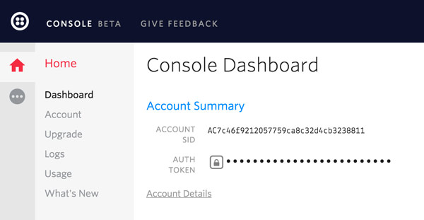 In order to keep the original sender in the loop you can now send them a text to let them know you're getting the weather. To do this you need to add a Twilio output node to the workflow. However, to configure this node you need to grab your Twilio SID and Auth token. This can be acquired from your Console Dashboard - just click the Home button on the left of screen.