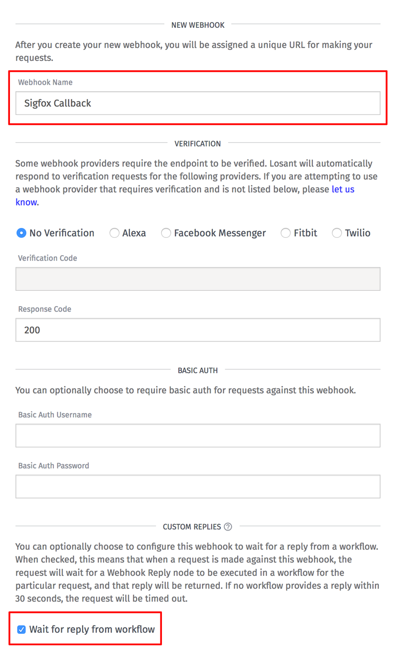You can name the webhook anything you'd like. Make sure to also check the "Wait for reply from workflow" checkbox. When Sigfox invokes a webhook, it expects a reply that indicates the message was successfully received. Within Losant, webhooks can trigger a workflow. We'll use this workflow to reply when we're done handling the Sigfox data.